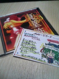 こちらが贈っていただいたCDとそれに添えられていたメッセージカードです!私にとって孔子の教えよりもありがたいお言葉に感激しまくりでした!(´;ω;`) このちびえーき様の可愛らしさはまさに\ゆ~じゃい!/