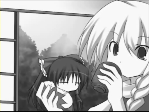 お茶請けに桜もちを食べる魔理沙。後にこの桜もちがきっかけで大変なことに・・・